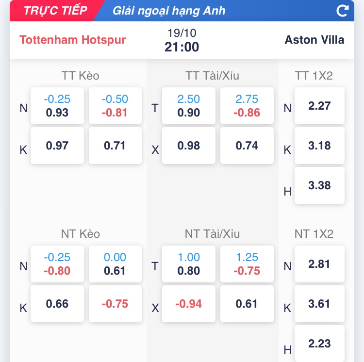 Tottenham Hotspur TÀI 2.5 FT ĂN 0.84